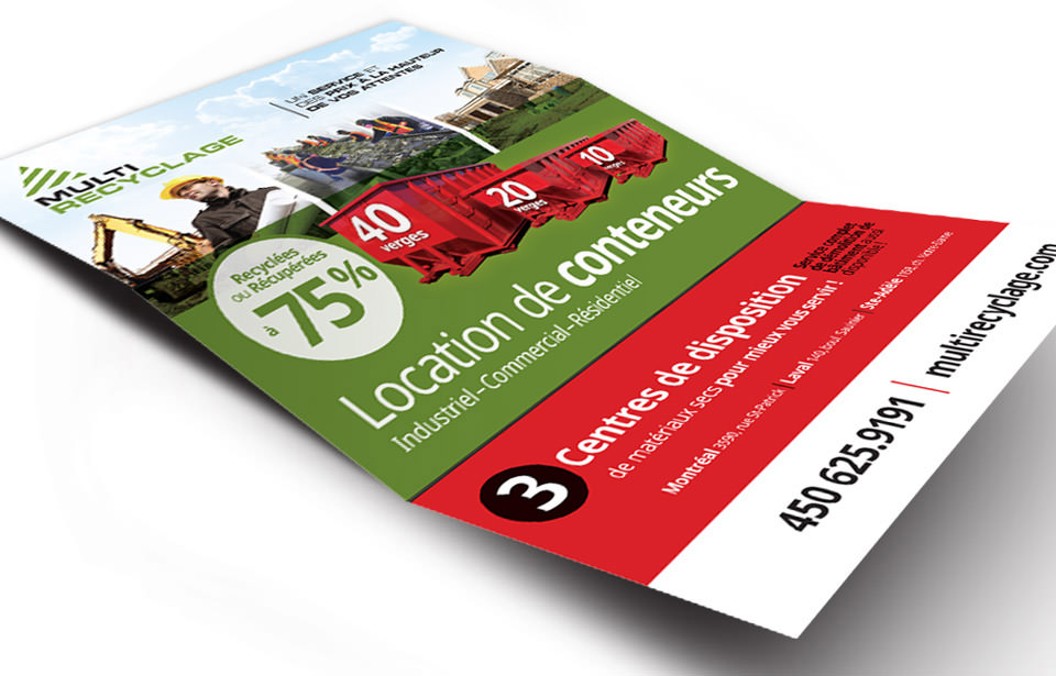Le mandat était de créer un dépliant bilingue à l'image du nouveau visuel développé pour Multi-Recyclage et qui met l'emphase sur le service de location de conteneurs. Les clientèles cibles sont autant les secteurs industriels, commerciaux ou résidentiels. Ces clientèles sont représentés sous forme d'image. Nous avons décidé de créer un visuel fort et dynamique qui présente les 3 types de conteneurs disponibles ainsi qu'une mention faisant part des 3 centres de dispositions de matériaux secs disponibles.