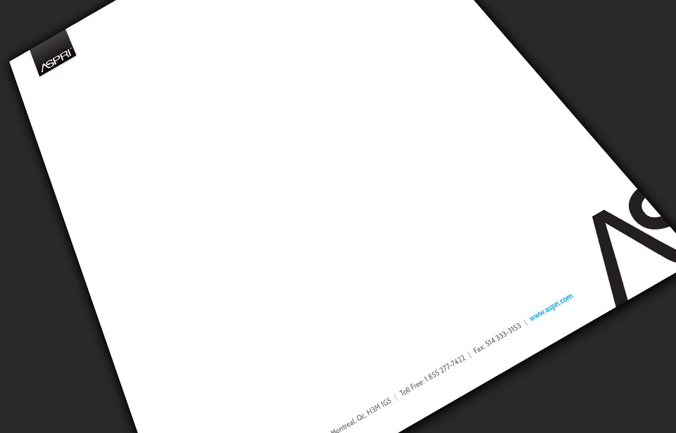 Nous avons conçu pour Aspri des cartes d'affaires au look épuré avec comme éléments graphiques les lettres du nom de l'entreprise.