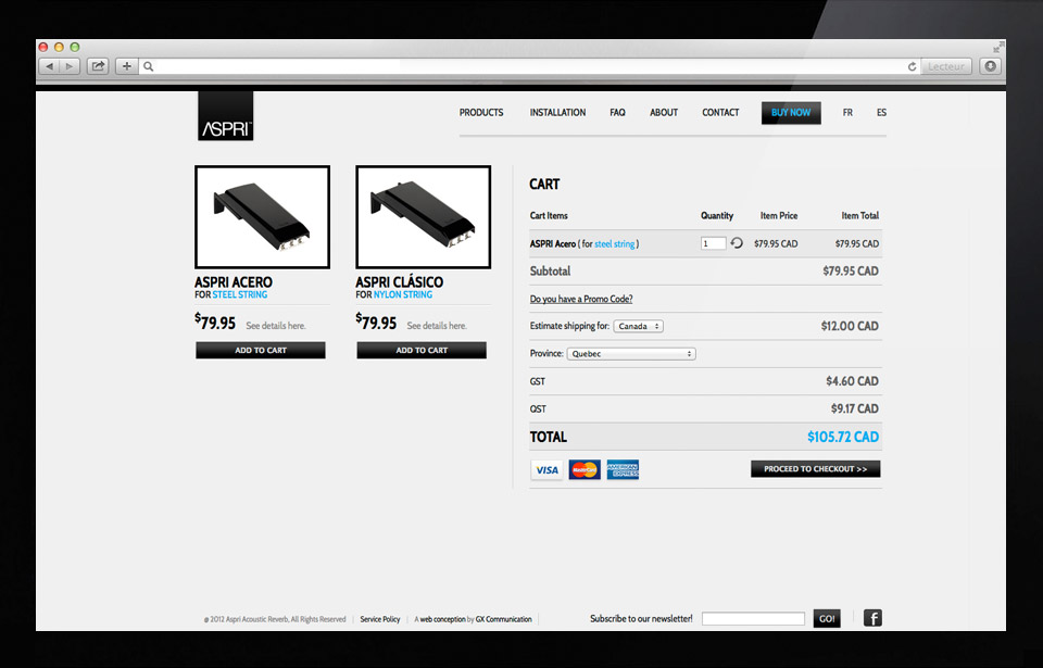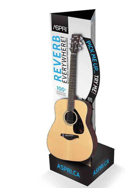Nous avons conçu cette structure pouvant recevoir une guitare sur laquelle le dispositif acoustique Aspri est installé. Le message sur le présentoir invite les gens à essayer la guitare et ainsi les persuader à acheter le produit.