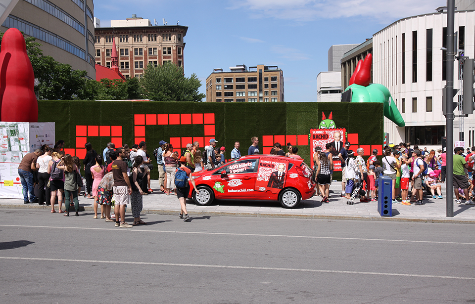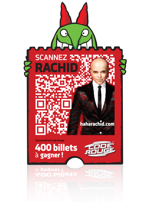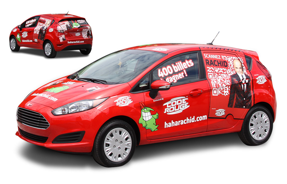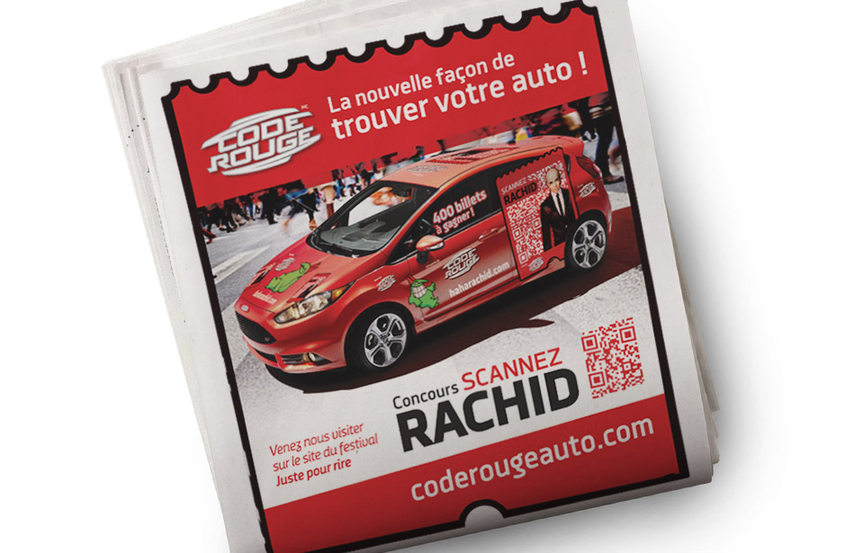 La campagne publicitaire du concours Scannez Rachid de Code Rouge comprenait l'habillage d'un véhicule qui servait de support publicitaire sur le site du Festival Juste pour rire. Le visuel avec les codes QR était un incitatif additionnel pour inviter les gens à scanner le code QR et participer au concours.