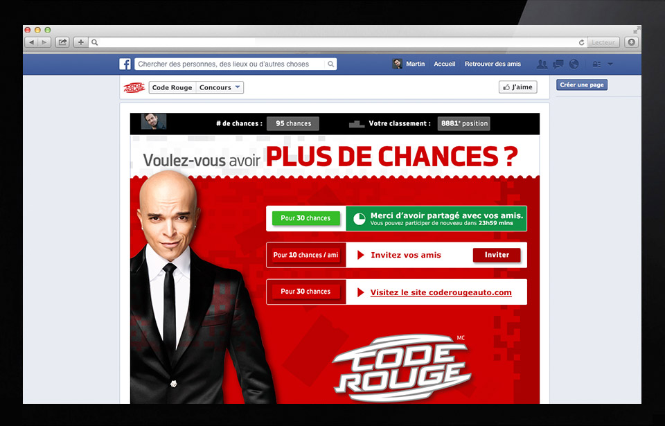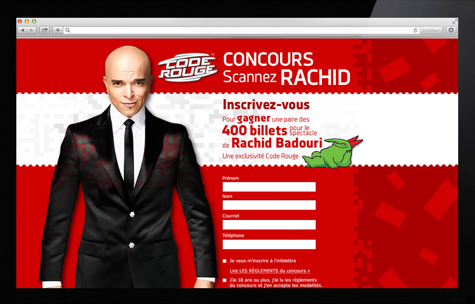 Notre client Code Rouger Média est l'agence derrière le site Code Rouge Auto qui a comme porte-parole Rachid Badouri. Afin de constituer une base de données de contacts susceptibles de devenir de futurs clients, l'agence a développé une campagne publicitaire sous forme de concours et à travers lequel les participants pouvaient gagner des billets de spectacles pour Rachid Badouri en s'inscrivant sur le site du concours.