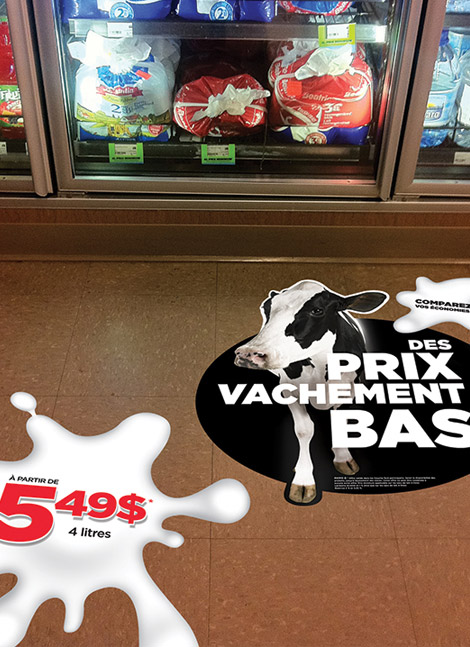 Nous avons créé un design imposant par son contraste noir et blanc. L’image de vache laitière que nous avons utilisée impose un lien direct avec le lait. Nous avons opté pour le slogan « Des prix vachement bas », ce qui donne le ton avec un message sans équivoque. Nous avons imprimé le tout sous la forme d’affiches de vitrines, de coiffe-pompes et d’autocollants pour le plancher et les portes.