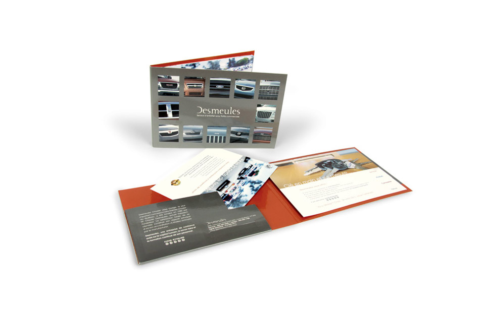 Nous avons réalisé une boite aux couleurs métalliques. Le dessus de la boite est orangé, couleur qui représente la communication et la réceptivité dans le rapport de l’entreprise avec ses clients. Le fond de la boite est argenté, ce qui rappelle le caractère sérieux et bien établi de Desmeules. Nous avons fait une découpe sur la couverture afin de laisser paraître les véhicules sur la pochette du document de vente. Aussi, nous avons réalisé le tout en utilisant un carton très épais, ce qui évoque la solidité de l’entreprise.