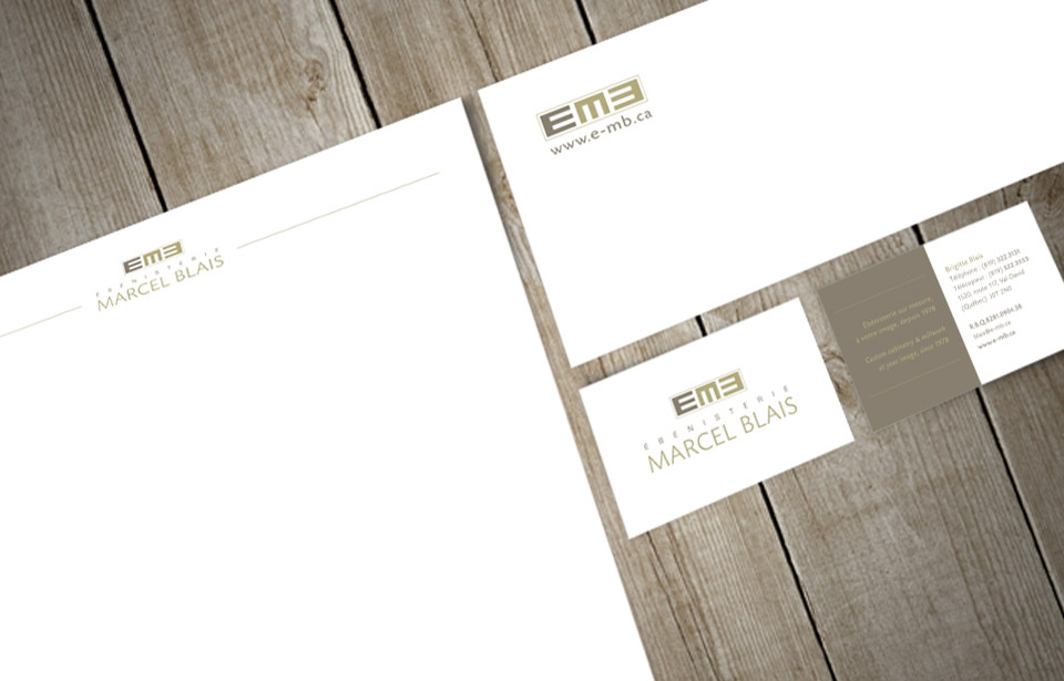 En plus de concevoir la signature graphique de l'Ébénisterie Marcel Blais, nous avons également conçu les éléments de papeterie tels que les entêtes de lettre, cartes professionnelles et factures.