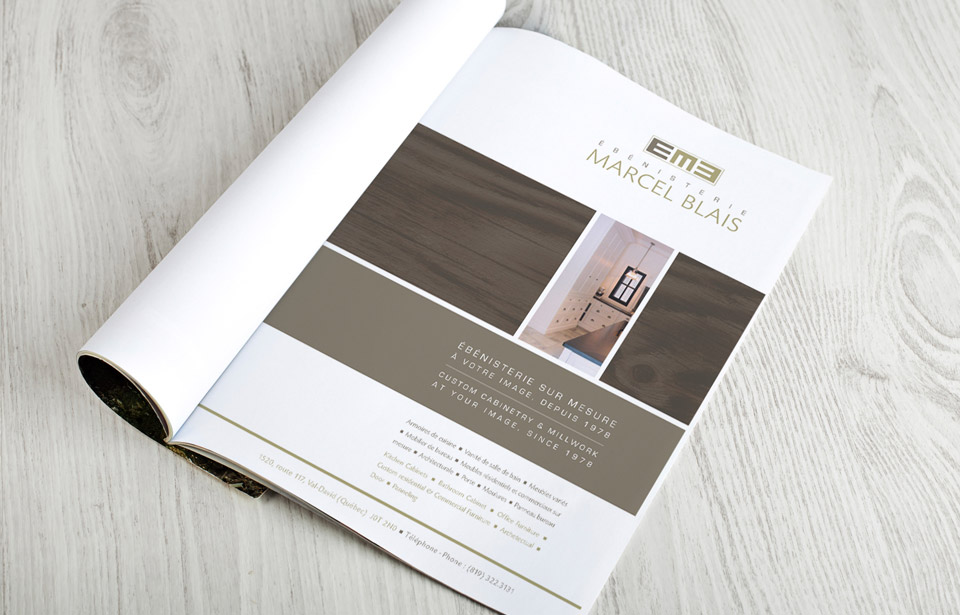 Nous avons réalisé une publicité à partir du visuel développé pour le site web de l'entreprise. Cette publicité montre une essence de bois exotique, matériaux de première qualité utilisés dans la conception des projets de l'Ébénisterie Marcel Blais.