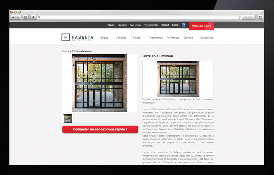 Nous avons conçu et programmé un site Web au design haut de gamme afin de bien représenter l’entreprise. Nous avons conçu des fiches de produits qui présentent de façon détaillée toutes les caractéristiques, les devis techniques et les normes observées pour chaque modèle de fenêtre. Nous y avons greffé un code Lightbox afin que les utilisateurs puissent voir les photos et les vidéos des produits dans une page à part.