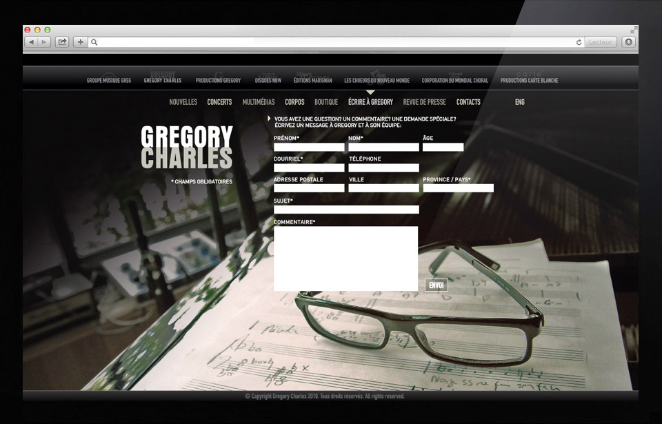 Le site Web comprend plusieurs sections permettant d'obtenir des informations à propos de Gregory Charles, des concerts à venir, des nouvelles ou encore les revues de presse.