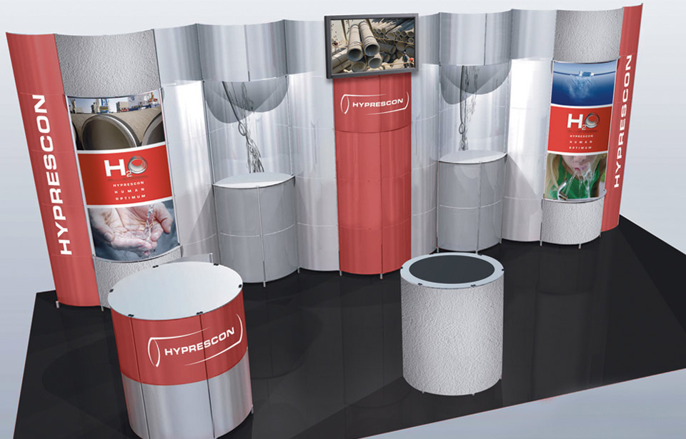 Notre mandat était de concevoir un kiosque aux couleurs de l'entreprise et représentant les services et produits disponibles. Les formes des tuyaux d'acier et de béton nous ont inspirés pour créer une structure avec des panneaux arrondis et des tables d'appoint de formes cylindriques comme ces tuyaux.
