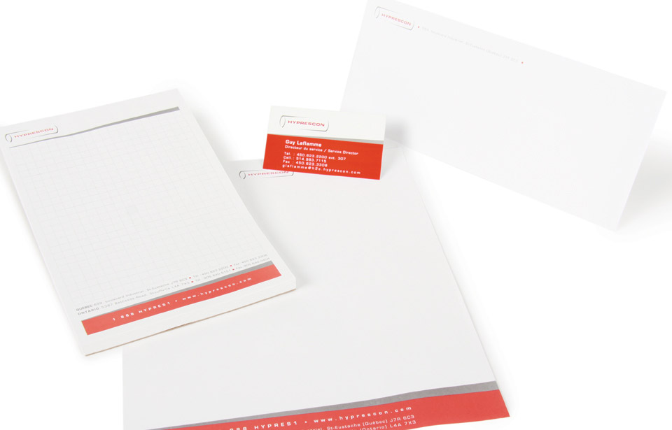 Nous avons réalisé des articles de bureau au style constant et unifié. On voit le logo ainsi qu’une bande rouge au bas de chaque item, ce qui dirige le regard vers les informations importantes de l’entreprise. Aussi, des traits gris au-dessus de la bande rouge rappellent la forme du tuyau utilisée dans le logo.