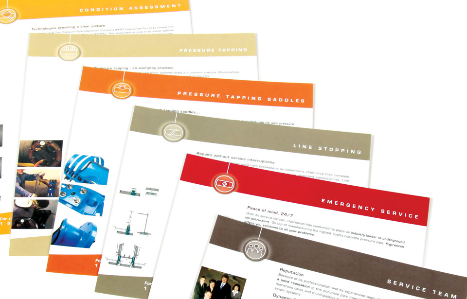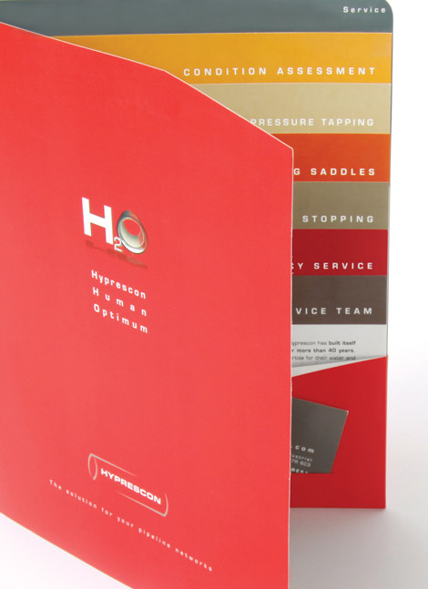 Nous avons réalisé un document en carton à trois volets, avec une découpe à la forme du logo sur la couverture. Nous avons choisi d’utiliser le rouge sur toute la couverture pour établir la compétitivité des prix et la longévité d’Hyprescon par rapport à ses compétiteurs. À travers la découpe de la couverture, on voit le nom de l’entreprise avec, en arrière-plan, de l’eau qui circule dans un tuyau invisible : ceci illustre en un coup d’œil la vocation d’Hyprescon. À l’intérieur, on retrouve les textes descriptifs. Nous avons utilisé un espacement très large entre les lignes de texte, ce qui rappelle l’idée de l’eau qui circule bien et augmente la qualité et la lisibilité du document.