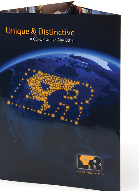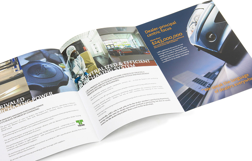Nous avons créé l’aspect visuel du document afin qu’il représente bien la force du réseau LAR : une coopérative qui n’a pas son pareil avec un pouvoir d’achat qui s’étend à travers l’Amérique du Nord. Nous avons choisi de présenter les points forts de l’entreprise en quatre volets, au moyen d’images. Le document de style corporatif s’agence avec les documents que nous avons déjà créés pour LAR (un guide illustré, des rapports annuels, des publicités). On retrouve le slogan de LAR, « Nous parlons le langage des concessionnaires partout dans la concession », du début à la fin du document de prospection, ce qui permet un effet de renforcement.