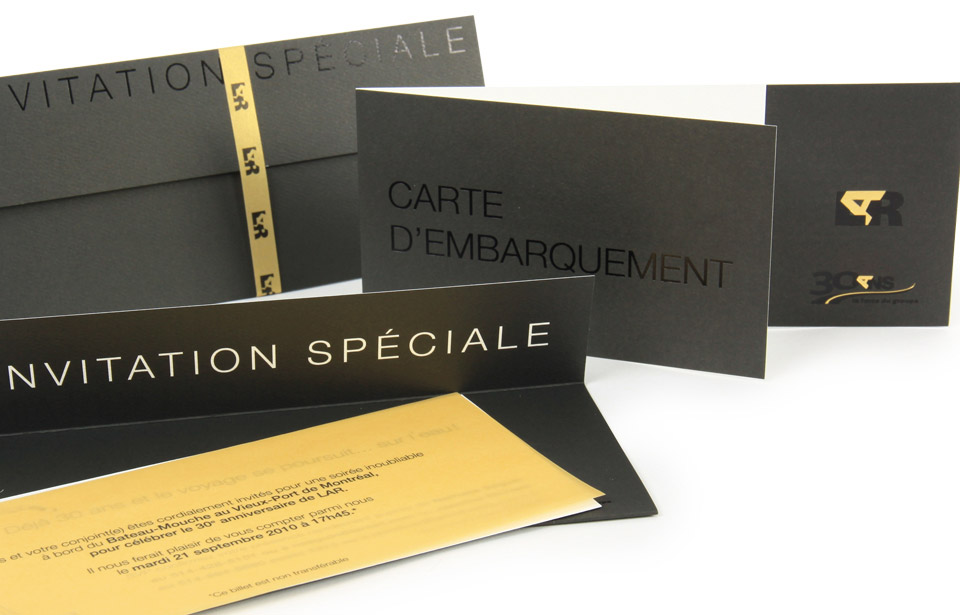 Le mandat était de créer une carte d’invitation et une carte d’embarquement au design prestigieux et haut de gamme pour l’événement du 30e anniversaire de LAR qui aurait lieu à Montréal sur le Bateau-Mouche.
