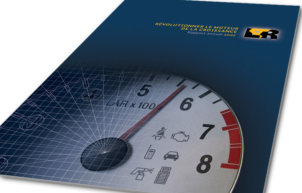 Le mandat était de concevoir le rapport annuel 2007 de LAR à l’image de la phrase clé de l’année 2007 : « Révolutionner le moteur de la croissance ». Il fallait qu’on y trouve les chiffres d’affaires de l’année 2007 fournis par PwC. Le client voulait que le design du document puisse supporter le texte, autant en français qu’en anglais.
