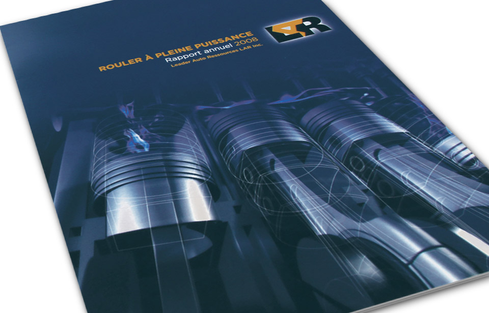 Le mandat était de concevoir le rapport annuel 2008 de LAR à l’image de la phrase clé de l’année 2008 : « Rouler à pleine puissance ». Il fallait qu’on y trouve les chiffres d’affaires de l’année 2008 fournis par PwC. Le client voulait que le design du document puisse supporter le texte, autant en français qu’en anglais.