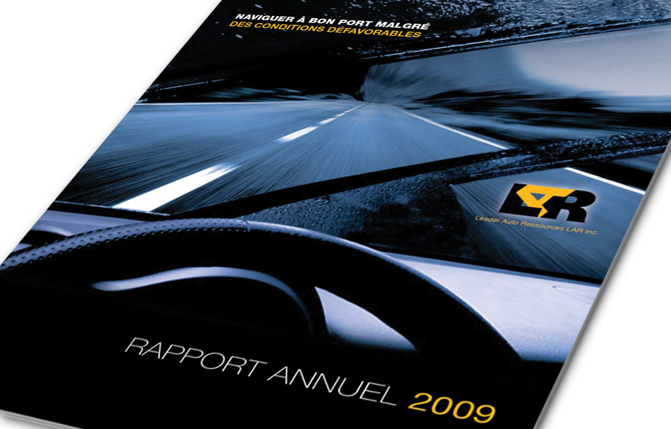 Le mandat était de concevoir le rapport annuel 2009 de LAR à l’image de la phrase clé de l’année 2009 : « Naviguer à bon port malgré des conditions défavorables ». Il fallait qu’on y trouve les chiffres d’affaires de l’année 2009 fournis par PwC. Le client voulait que le design du document puisse supporter le texte, autant en français qu’en anglais.