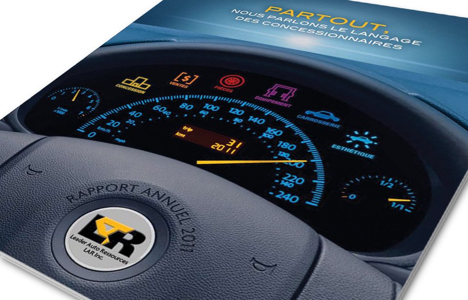 Le mandat était de concevoir le rapport annuel 2011 de LAR à l’image de la phrase clé de l’année 2011 : « Partout, nous parlons le langage des concessionnaires ». Il fallait qu’on y trouve les chiffres d’affaires de l’année 2011 fournis par PwC. Le client voulait que le design du document puisse supporter le texte, autant en français qu’en anglais.