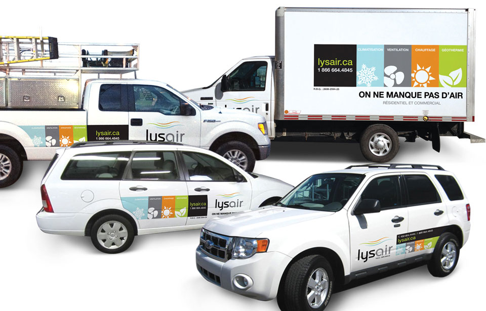 Le lettrage de la flotte de véhicules de l'entreprise Lysair a également fait partie de notre mandat. Nous avons décliné le logo et icônes sur les différents véhicules de service.