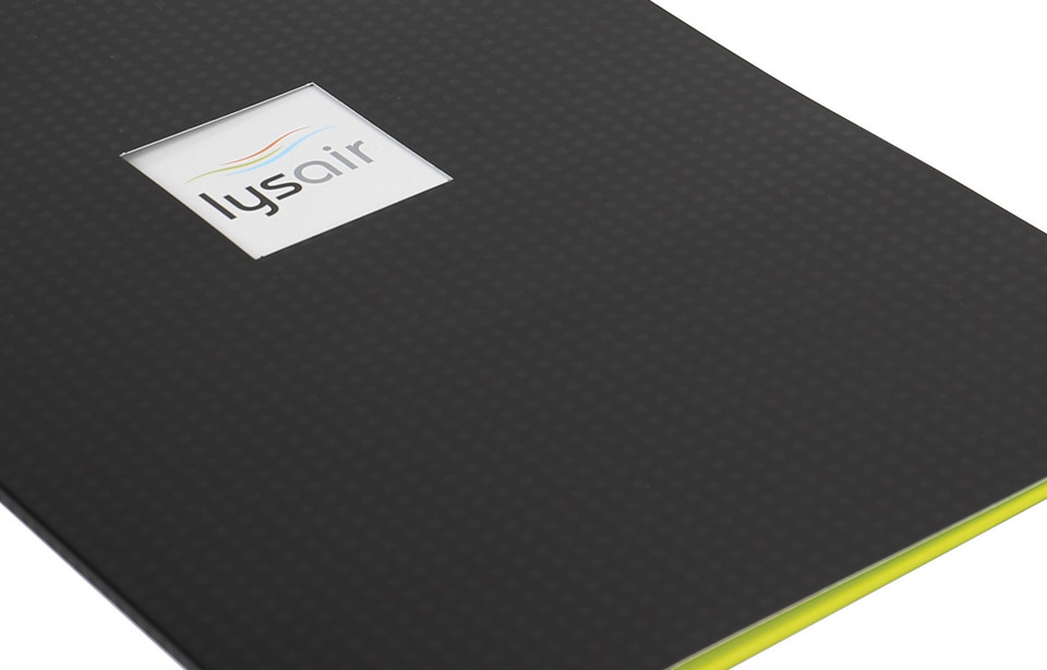 Nous avons conçu une pochette corporative aux couleurs de l'entreprise. En couverture, une découpe carré permet de voir le logo Lysair et ajoute un aspect professionnel au document.