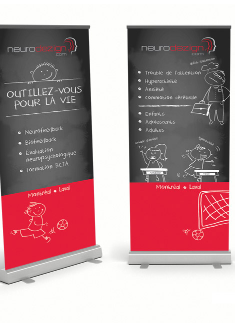 Suite à la conception du document corporatif, nous avons repris le contenu visuel pour créer 2 bannières autoportantes qui sont érigées lors de congrès, colloques ou expositions.