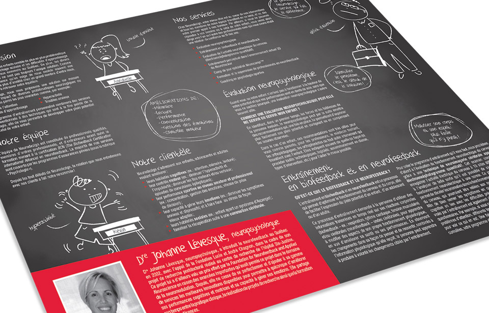 Le mandat était de créer des cartes d’affaires pour les différents spécialistes chez Neurodezign et d’y intégrer les principaux programmes disponibles.