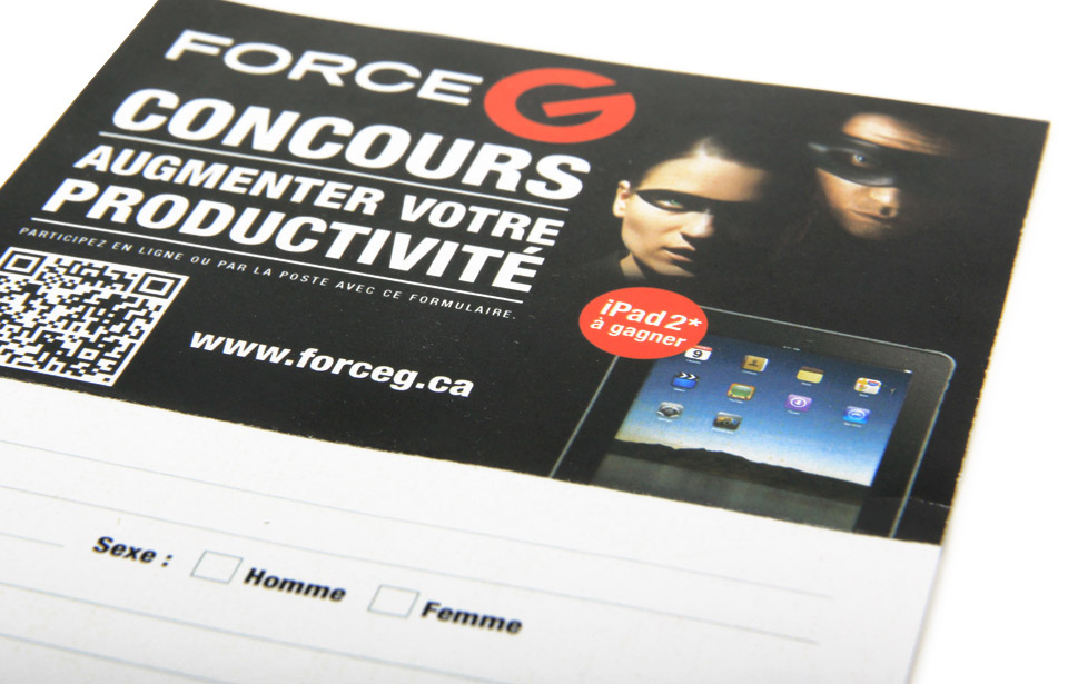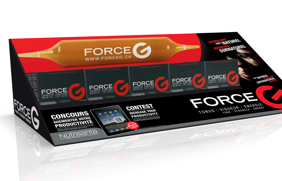 Le mandat était de retravailler le design du présentoir d’accès rapide pour les produits Force G de manière à ce que les gens comprennent que ceux-ci s’adressent aux hommes et aux femmes. Le présentoir servant aussi à annoncer le concours « Augmenter votre productivité », il fallait ajouter l’image du prix à gagner, un iPad, de même qu’un code QR menant directement à la page Web du concours.