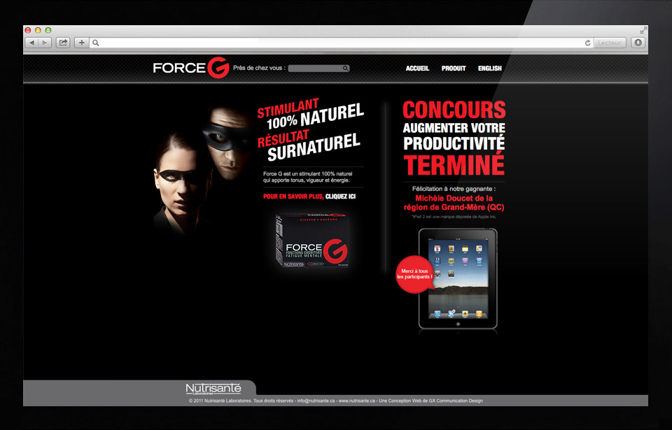 Le mandat était de créer le site Web du produit Force G en conservant le nouveau look des superhéros. Il fallait aussi que le site Web permette la participation en ligne au concours « Augmenter votre productivité ».