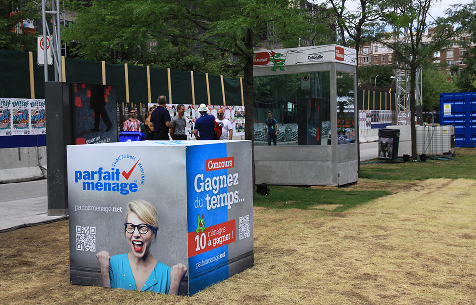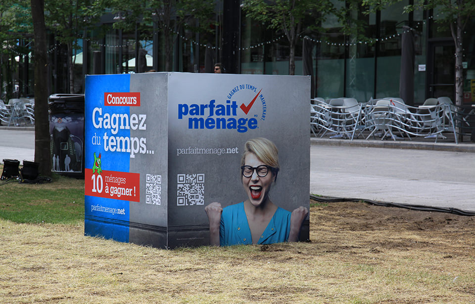 Comme outil publicitaire principal sur le site, nous avons construit un cube de bois identifié aux couleurs du concours et du client Parfait Ménage.
