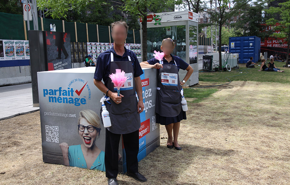 Afin de faire la promotion du concours et de l'entreprise sur le site du festival, des animateurs habillés en hommes et femmes de ménage circulaient près du cube publicitaire en remettant les signets et en incitant les gens à s'inscrire sur le site de Parfait Ménage.