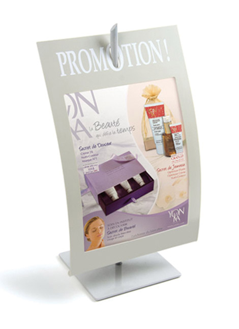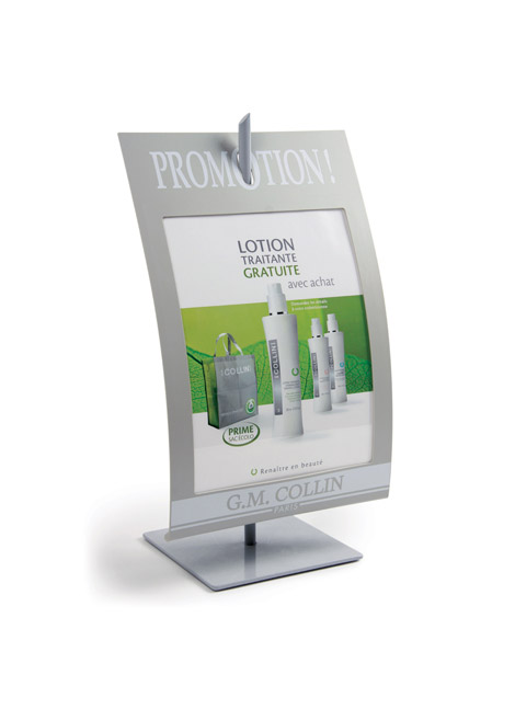Nous avons créé une affichette faisant référence à l’aspect écologique du produit et de son emballage. Afin de suggérer la pureté et la richesse, nous avons disposé les éléments de la promotion devant une bande verte, sur fond blanc. Sur la bande verte, derrière les produits, nous avons ajouté l’image d’une feuille en plan rapproché : celle-ci fait partie de l’image de marque de G.M. Collin. Le vert rappelle l’aspect écologique de la lotion, et la disposition horizontale évoque la détente. Le titre de la promotion forme un carré dans le haut de l’affichette, ce qui représente la stabilité et la confiance.