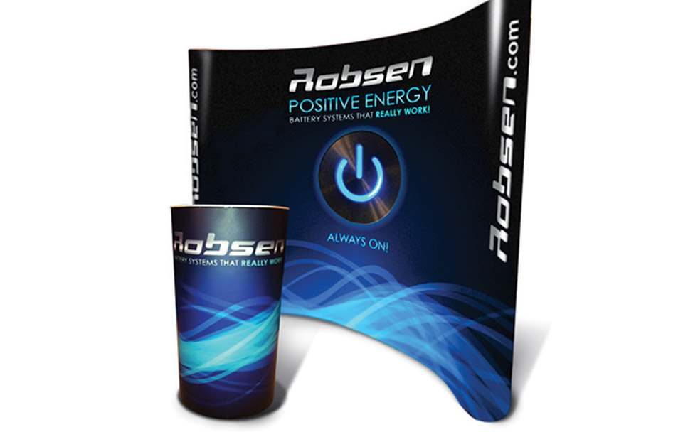 Nous avons conçu un design pour le kiosque qui attire l’attention par la simplicité de son concept : l’entreprise y est représentée par un bouton d’alimentation grand format, appuyé par le slogan « Always On! ». Nous avons opté pour des couleurs telles que le noir et le bleu électrique. Le noir donne l’impression d’une panne d’électricité tout autour, et le bleu montre, en contraste, l’énergie Robsen, continuellement à pleine puissance.